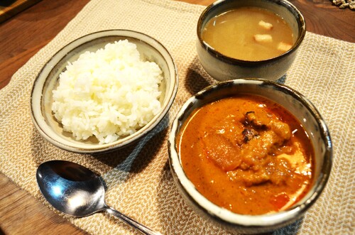 原材料:たまねぎ(山口県産),鶏もも肉,鶏ガラスープ,トマト,ココナッツクリーム,バター,マーマレード,ヨーグルト,しょうが,にんにく,食塩,コリアンダー,クミン,ターメリック,パプリカ,フェヌグリーク,ガラムマサラ,クローブ,カルダモン,シナモン(原材料の一部に乳成分・オレンジ・鶏肉を含む)